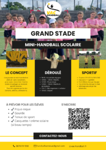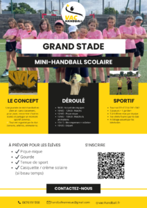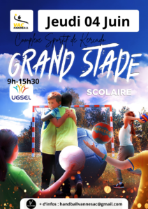 Fort du succès des précédentes éditions, le Vannes AC Handball renouvelle l’opération Grand Stade. Les élèves participent à une journée complète de mini-handball en plein air, sans classement, axée sur le plaisir de jouer, la rencontre entre écoles et la découverte du handball.